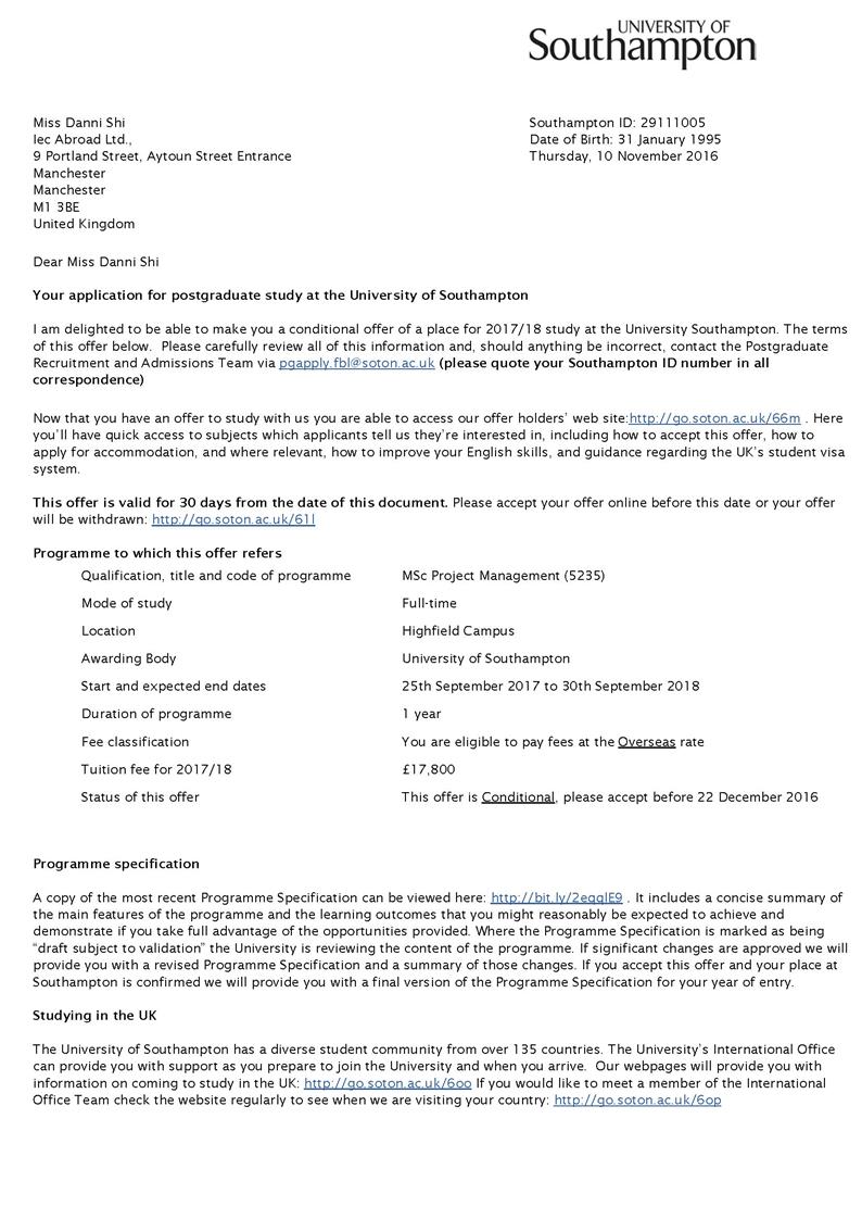13级史丹妮同学获得南安普顿大学硕士Offer。
